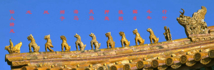 把这些小兽依次排列在高高的檐角处,象征着消灾灭祸,逢凶化吉,还含有剪除邪恶、主持公道之意。古人把建筑装饰上这些走兽,使古建筑更加雄伟壮观,富丽堂皇,充满艺术魅力。