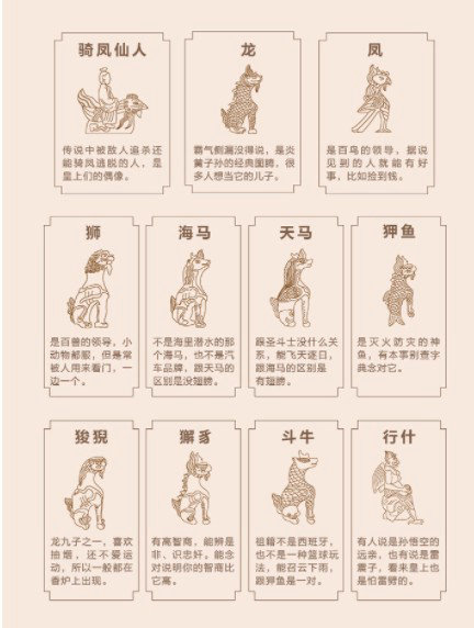 10.行什:一种带翅膀猴,背生双翼,手持金刚宝杵,传说宝杵具有降魔的功效。因排行第十,故名“行什”。颇像传说中的雷公,大概是防雷的象征。古代建筑上的脊兽,可见的行什仅一处,就是在太和殿上。